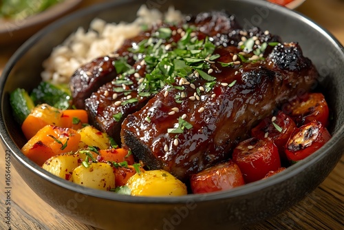 Glazed beef short ribs served with roasted vegetables and rice in dark ceramic bowl, garnished with sesame seeds and fresh herbs, close up food photography.