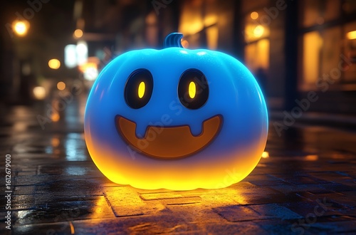Glowing blue cartoon pumpkin with orange face on wet city street at night halloween