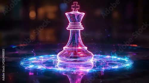 Glowing chess king piece in neon pink stands on mystical blue circular pattern, dramatic lighting creates magical atmosphere against dark background.