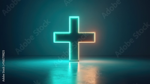 Glowing green plus sign floating in a dark environment with vibrant neon lighting effects
