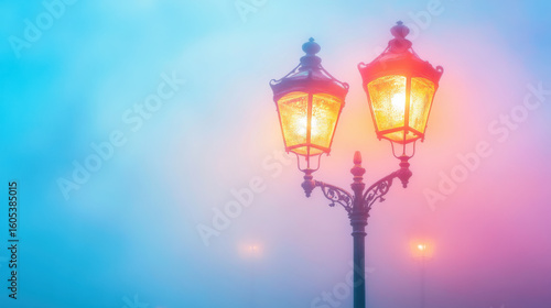 Glowing Iridescent Streetlamp in Soft Fog with Colorful Hues Background on white background