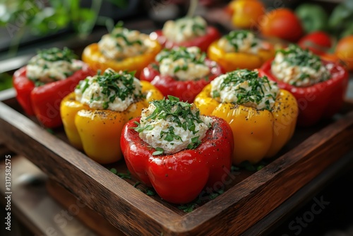 goat, cheese, stuffed, pepper, mini, vibrant, halved, smooth, lemony, creamy, roasted, raw, sweetness, contrast, herb, fresh, sprinkle, drizzle, olive, oil, elegance, wooden, platter, ceramic, dish, presentation, rustic, flavorful, rich, soft, texture, gold, colourful, delicious, savoury, epicure, balanced, artisanal