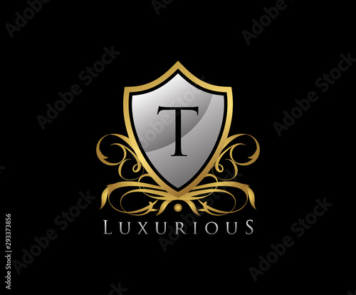 Gold Shield T Letter Logo. Gold Vintage Shield With T Letter prefect for boutique, hotel, restaurant, wedding and other elegant business.