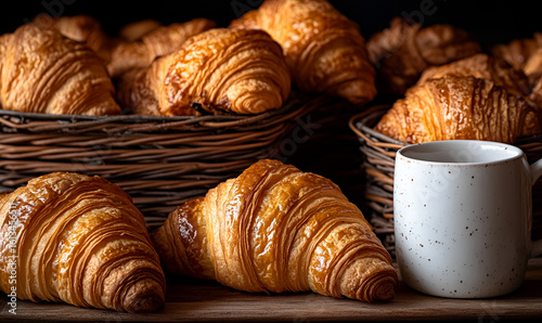 Golden brown, flaky croissants fill wicker baskets, with one pastry and a coffee mug on a rustic table.