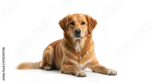 dog, gold, retriever, animal, canino, mammal, pet, friends, domestic, fur, furry, portrait, studio, shot, white, background, isolated, lying, down, relaxed, calm, peaceful, happy, friendly, companion, adorable, cute, lovable, breed, purebred, pedigree, alert, watchful, attentive, watching, looking, gazing, eye, face, brown, tan, light, shadow, paw, leg, ear, nose