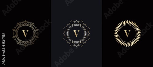 Golden Emblem Letter V Luxury Decoration Initial Logo Icon, Elegance Set Gold Ornate Emblem Deco Vector Design
