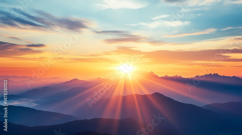 Golden Embrace: Sunbeams cascade over majestic mountain peaks as the sun ascends, painting the sky with vibrant hues and heralding a new dawn.