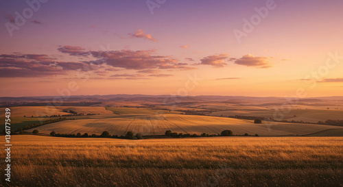 field, landscape, sunset, rolling hills, gold, sky, cloud, horizon, rural, countryside, agriculture, nature, scenic, view, dusk, dawn, sun, light, peaceful, calm, tranquil, idylli, pastoral, open, vista, panorama, tree, grass, summer, warm, evening, outdoors, environment, beauty, serene
