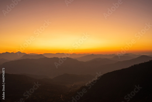 Golden Horizon: A breathtaking panorama captures the serene beauty of layered mountain ranges bathed in the soft, amber glow of a setting sun.
