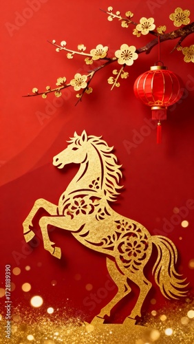 Golden horse with red lantern and plum blossoms