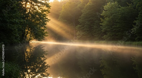 lake, forest, sunlight, ray, dawn, morning, tree, water, mist, fog, gold, calm, serene, peaceful, tranquil, nature, landscape, scenic, beautiful, photo, image, photo, picture, environment, wood, vegetation, atmosphere, light, sunrise, summer, idylli, quiet, still, colours, shadow, sky, tree, sun, river, green, autumn, misty, wood