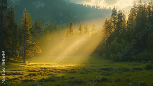 Golden Rays of Sunlight Filtering Through Trees in a Serene Green Forest Tranquil Nature Photography
