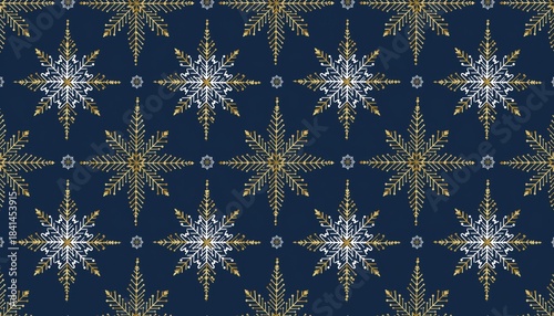 Golden Snowflake Pattern: A festive arrangement of golden and white snowflakes, set against a deep blue backdrop, creates an elegant and captivating pattern, perfect for holiday-themed designs.