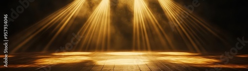 Golden spotlight illuminating a dark stage, soft beams spreading outwards, elegant and regal mood