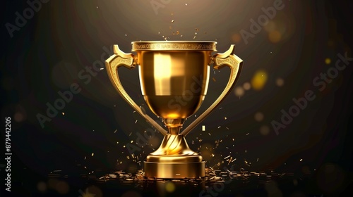 Golden trophy on a dark background with glittering confetti, symbolizing victory and celebration, horizontal photo, place for text concept: golden trophy, victory celebration, award achievement