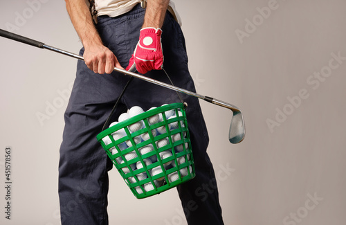 Golfer wearing glove and holding an iron and a basket full of golf balls to go to the driving range