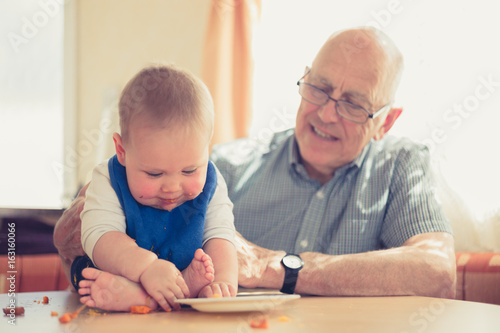 baby, bib, food, grandchild, grandparent, happiness, happy, home, adult, boy, caucasian, children, cute, eating, excitement, family, feeding, fun, girl, granddaughter, grandfather, grandson, indoor, joy, laughing, learning, leisure, lifestyle, little, love, male, man, old, people, plate, playing, senior, small, smiling, sunny, teething, tiny, young