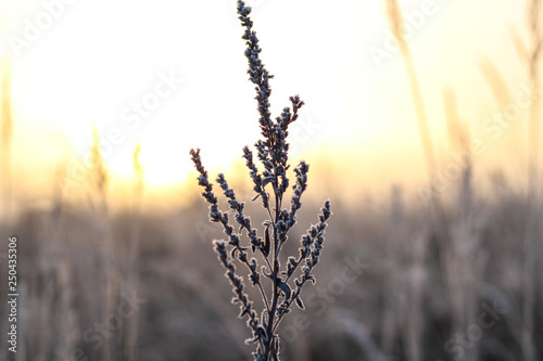 Grass with frost. Sunrise and frosts. Grass. Early spring Macro shooting of plants