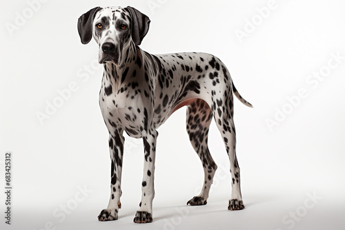 Great Dane dog standing on a white background. Animal left-side portrait.