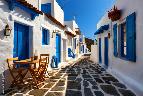 Greece's Mykonos: On a bright summer morning, a typical whitewashed street in the town features blue doors and windows.