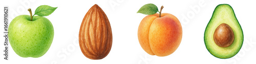 apple, almond, apricot, avocado, watercolor, fruit, green, fresh, healthy, natural, organic, sweet, ripe, seed, leaf, snack, vegetarian, vegan, earth, day, food, nourishment, diet, vitamin, dessert, juicy, summer, harvest, raw, wholesome, closeup, isolated, single, plant, eating, wellness, energy, fiber
