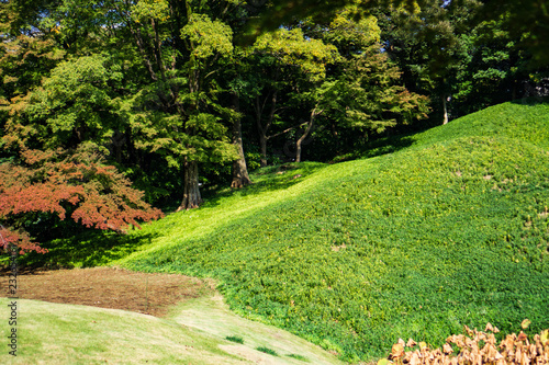Green grass hill in Japanese garden when the leaves turn red with yellow and green leaves background (Koishikawa Korakuen, Tokyo, Japan)