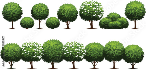 Green leafy tree and bush collection, garden landscape foliage set, natural plant environment design, cad drawing flat vector illustration, outdoor greenery art.