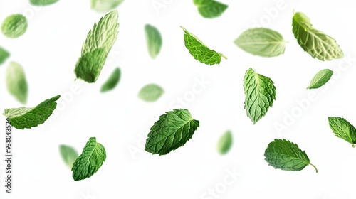 Green Mint Leaves Floating in Air with White Background.