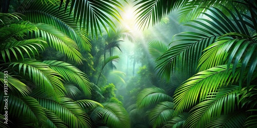 Green palm leaves creating a tropical rainforest background, nature, abstract, foliage