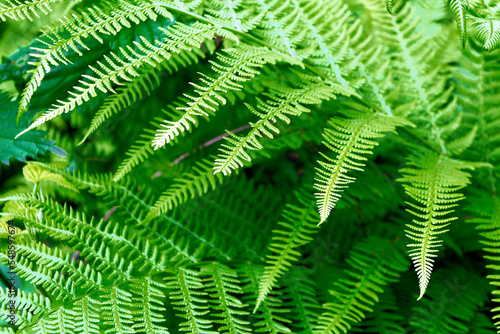 Green summer fern leaf in the forest. Dark vintage background.