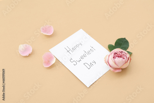 Greeting card with text HAPPY SWEETEST DAY and rose flower on beige background. National Sweetest Day
