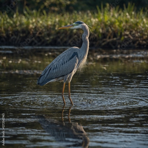 Grey Heron portrait Grey heron, Ardea cinerea, a massive gray bird wading through a flat lake searching for fish A great blue heron standing majestically in shallow water.