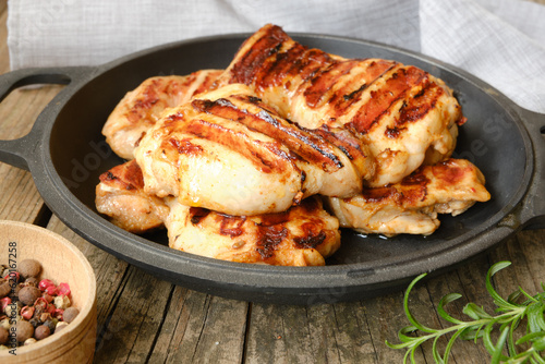Grilled chicken thigh fillet steak on a wooden table in a cast iron pan.