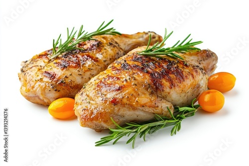 chicken, grilling, cooked, roasting, food, serving, plating, resting, isolated, closeup, studio shot, white background, half face, single object, meal, lunch, dinner, meat, poultry, ingredient, garnish, rosemary, herb, tomatoes, yellow, favor, fresh, delicious, dish, culinary, gastronomy, receipe, nourishment, diet, healthy, eating, cookery, eatery, cookery, preparation