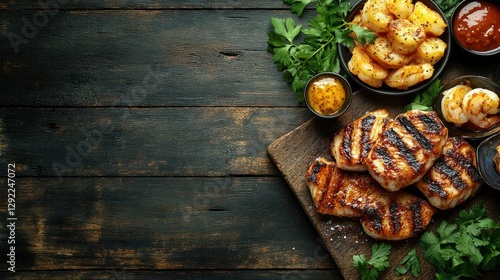 grilled, fish, shrimp, food, seafood, dinner, meal, rustic, wooden, table, delicious, dinnerware, bar-b-q, eatery, party, summer, diet, healthy, diet food, protein, receipe, cooking, cookery, epicure, homemade, party food, picnic, catering, background, topview, closeup, horizontal, image, photo, photo, fresh food