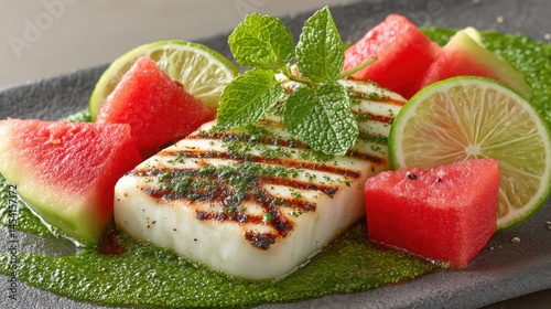 Grilled halloumi cheese with watermelon, lime, mint, and pesto on a plate.