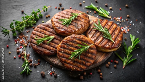 Grilled meat cutlets with herbs on dark background
