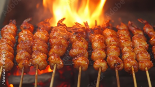 Grilled Shrimp Skewers Over Open Flame with Fiery Background