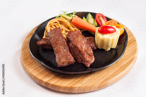 steak, beef, meat, vegetable, noodle, boiled, rib, finger, dinner, food, lunch, meal, cooked, corn, tomatoes, carrot, iron, plate, wooden, white, background, dish, grilled, fillet, portion, eatery, vegetable, bar-b-q, diet, dining, eat