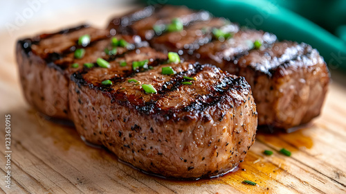 Grilled steaks on wooden board, kitchen background