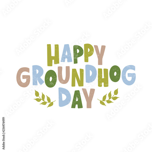 groundhog, day, happy, vector, lettering, illustration, design, card, greeting, celebration, text, background, holiday, february, winter, tree branch, leaf, hand, symbol, fun, typography, graphic, art, isolated, poster, banner, meteorology, spring, weather, drawn, traditional, sun