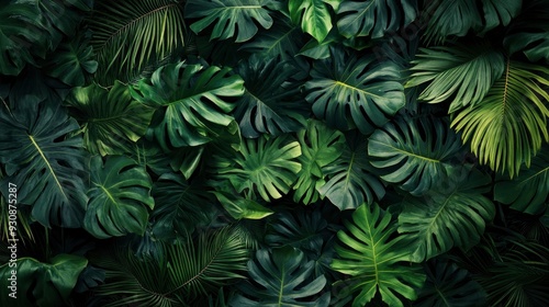 Group background of dark green tropical leaves ( monstera, palm, coconut leaf, fern, palm leaf,bananaleaf) Panorama background. concept of nature , ai