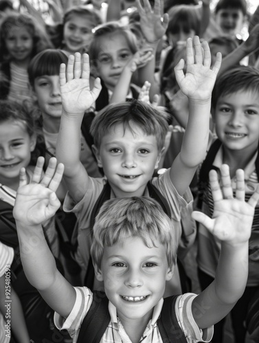 children, school, education, cheerful, excited, hand, up, waving, young, classroom, celebratory, smile, backpack, group, positive, emotion, public, raising, energy