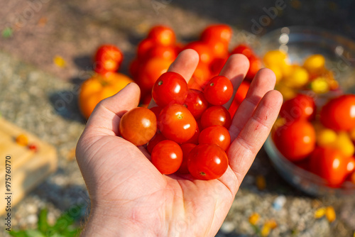 Growing Tomatoes. Multiple colored Tomatoes. Harvesting colorful Tomatoes. Cherry, red, yellow and big orange tomato. Hand Holding Artisan Blush Tiger. Hand Holding Tomato.