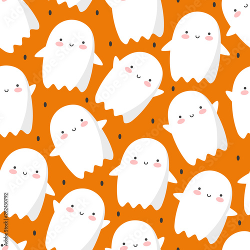 Halloween cute ghost pattern, seamless background, holidays cute ghost cartoon character, halloween cute icon flying ghost logo, vector illustration