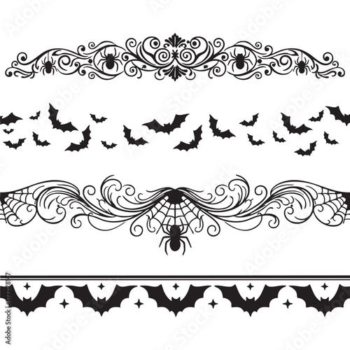 Halloween decorative borders and dividers silhouette featuring spiders spiderwebs and flying bats for spooky design elements