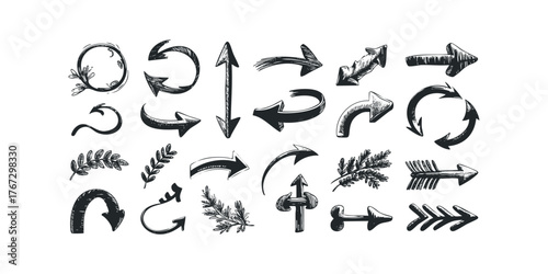 arrow, hand, drawn, collection, direction, curved, circular, tree branch, leaf, symbol, infographic, set, graphic, design, element, vignetting, mark, organic, simple, creative, tool, guide, pointer, navigation, icon, journey