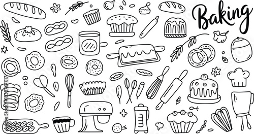 Hand drawn bakery bread and pastry illustration set, vintage sketch food collection with loaves, croissants, pizza slices, tea pots and herbs