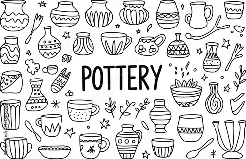 Hand Drawn Doodle Illustrations of Pottery Vessels and Craft Tools Keywords: pottery, ceramic