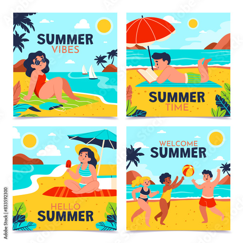 Hand drawn flat summer square card set